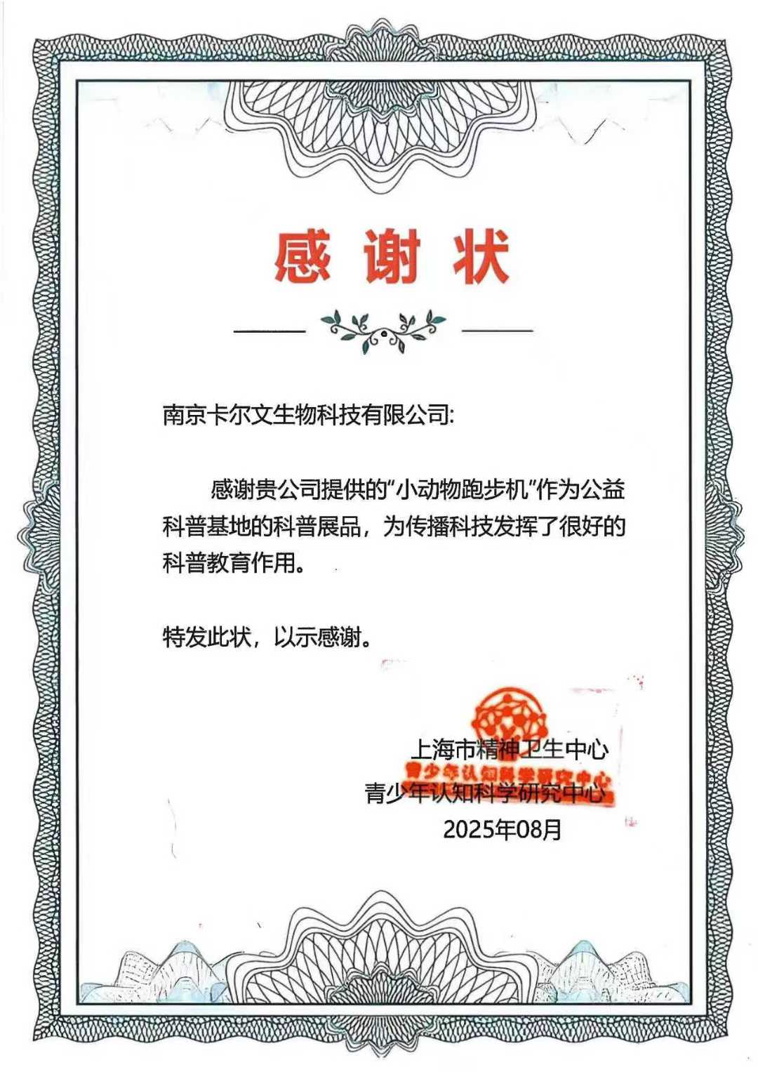 我公司的“小动物跑步机"参加由“青少年认知科学研究心”与“上海市精神卫生中心”举办的公益科普基地展览,作为公益科普基地的科普展品,为传播科技发挥了很好的科普教育作用。